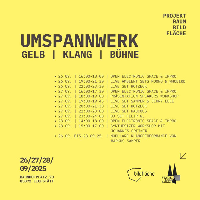 Die Bildfläche wird zum „Umspannwerk“: ein Ort, an dem Energie in Klang, Farbe und Begegnung übersetzt wird. Alles ist gelb – und dazu entfaltet sich ein intensives Wochenende voller elektronischer Live-Sets, offener Improvisationen, Workshops und Präsentationen. Das ganze Wochenende über läuft eine modulare Klangperformance von Markus Samper, die den Raum in stetig wechselnde Schwingungen versetzt.