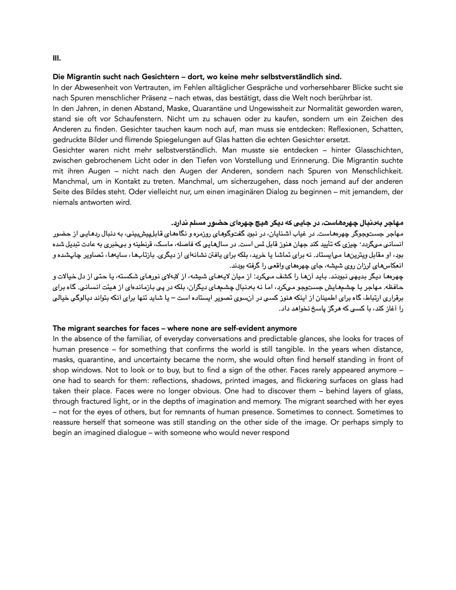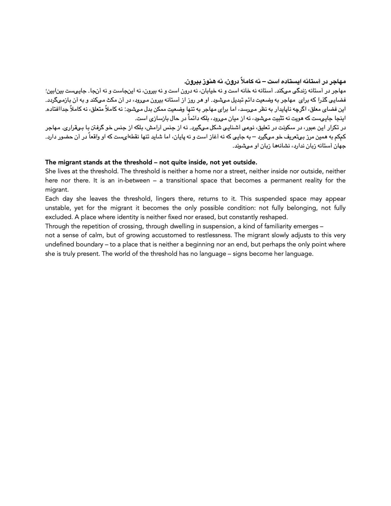 Begleitet werden die Fotografien von kurzen, mehrsprachigen Texten, die persönliche, emotionale und politische Perspektiven zusammenführen und Beobachtung und Erinnerung miteinander verweben.